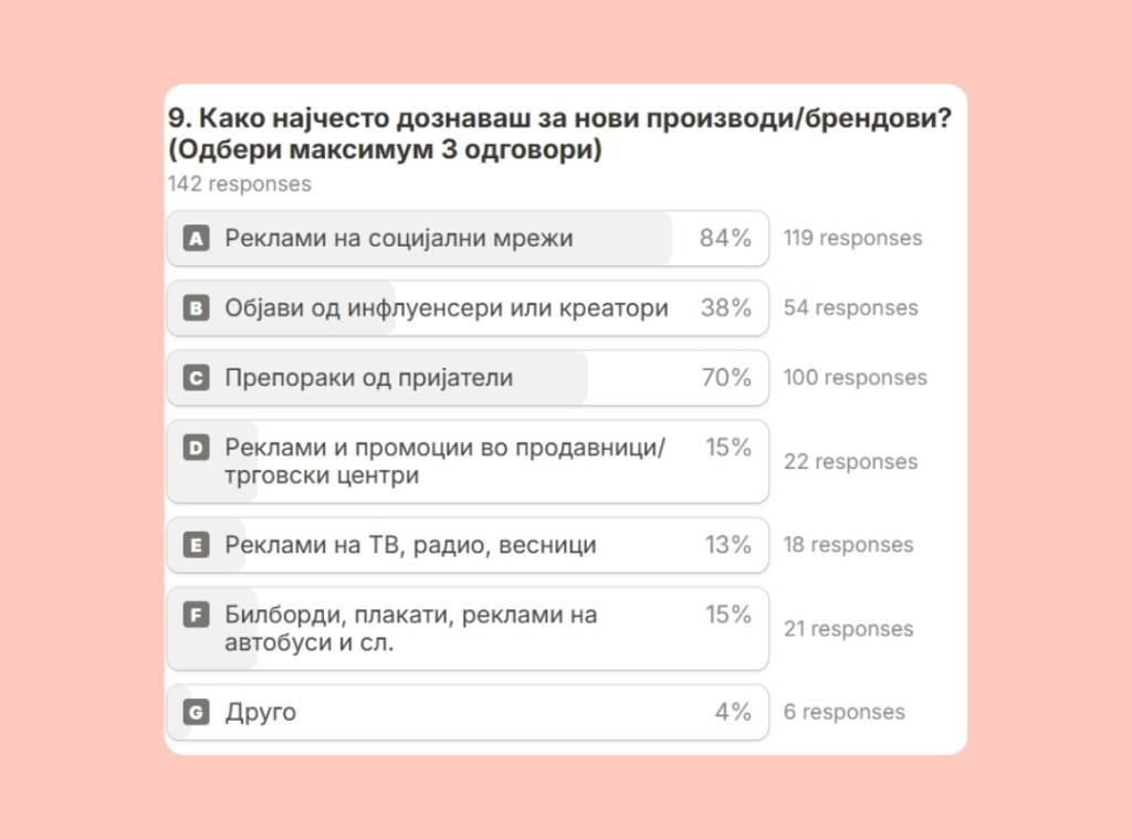84% say they learn about new brands through social media ads. Word of mouth remains a powerful second force, proving that recommendations still matter.