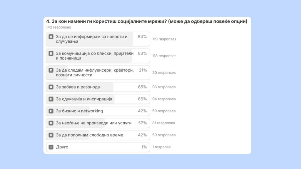 Primarily to stay informed. 84% use it to follow news and events, and 83% to keep in touch with friends, family, and acquaintances. Education and inspiration matter too (66%), almost as much as fun and entertainment (65%). Social media is also a key place for discovering products and services.