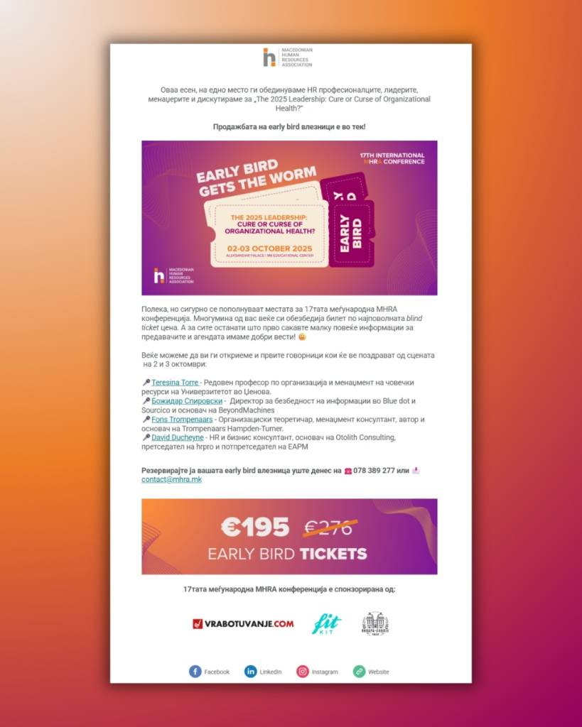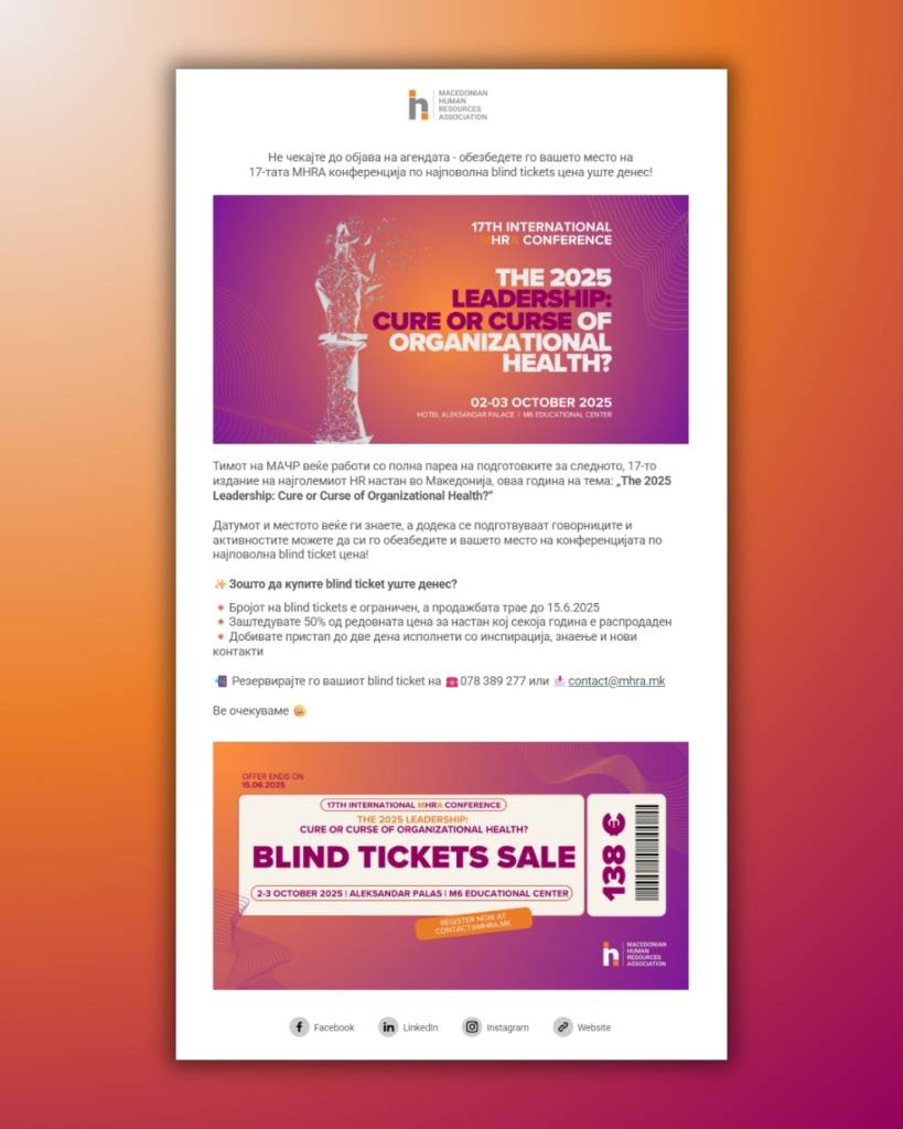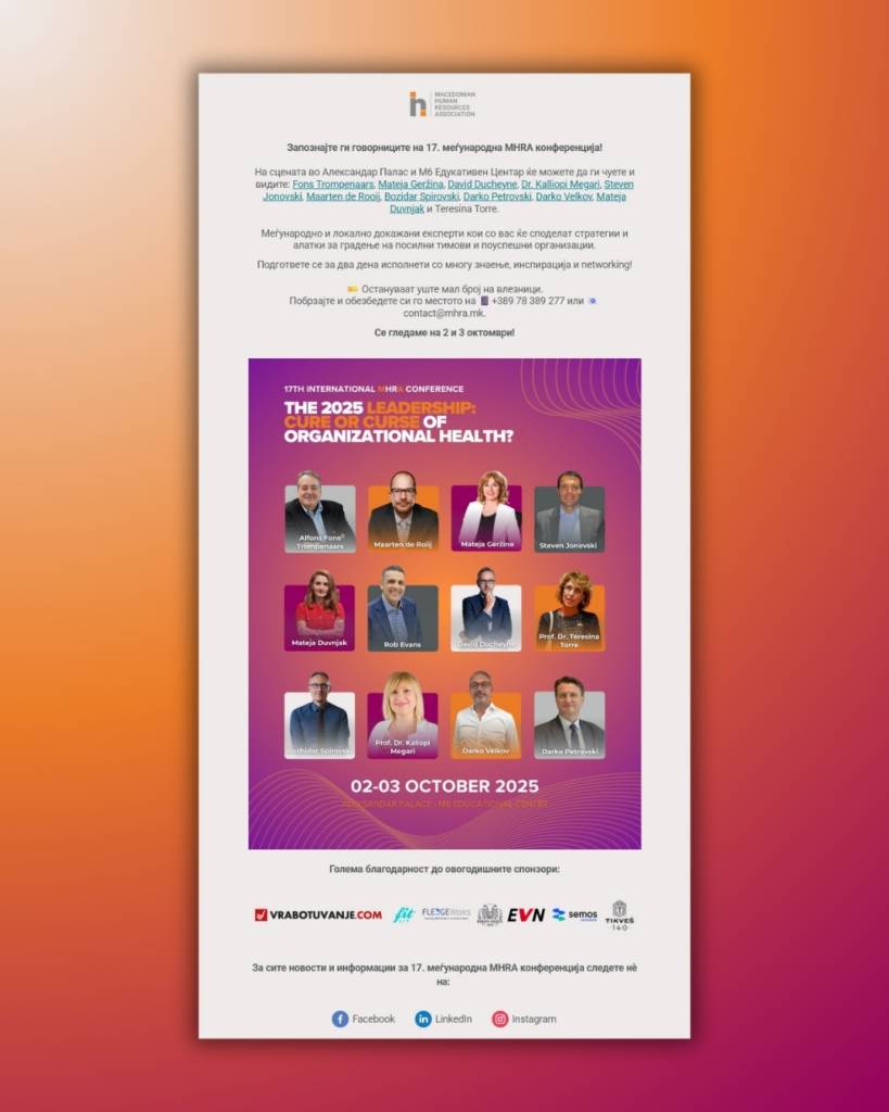 As the largest HR event in the country, the 17th International MHRA Conference aimed to explore a provocative theme: “The 2025 Leadership – Cure or Curse of Organizational Health?” The challenge was to translate this thought-provoking question into a powerful communication and visual identity that would capture attention, provoke reflection, and unite HR professionals under one conversation about the future of leadership.